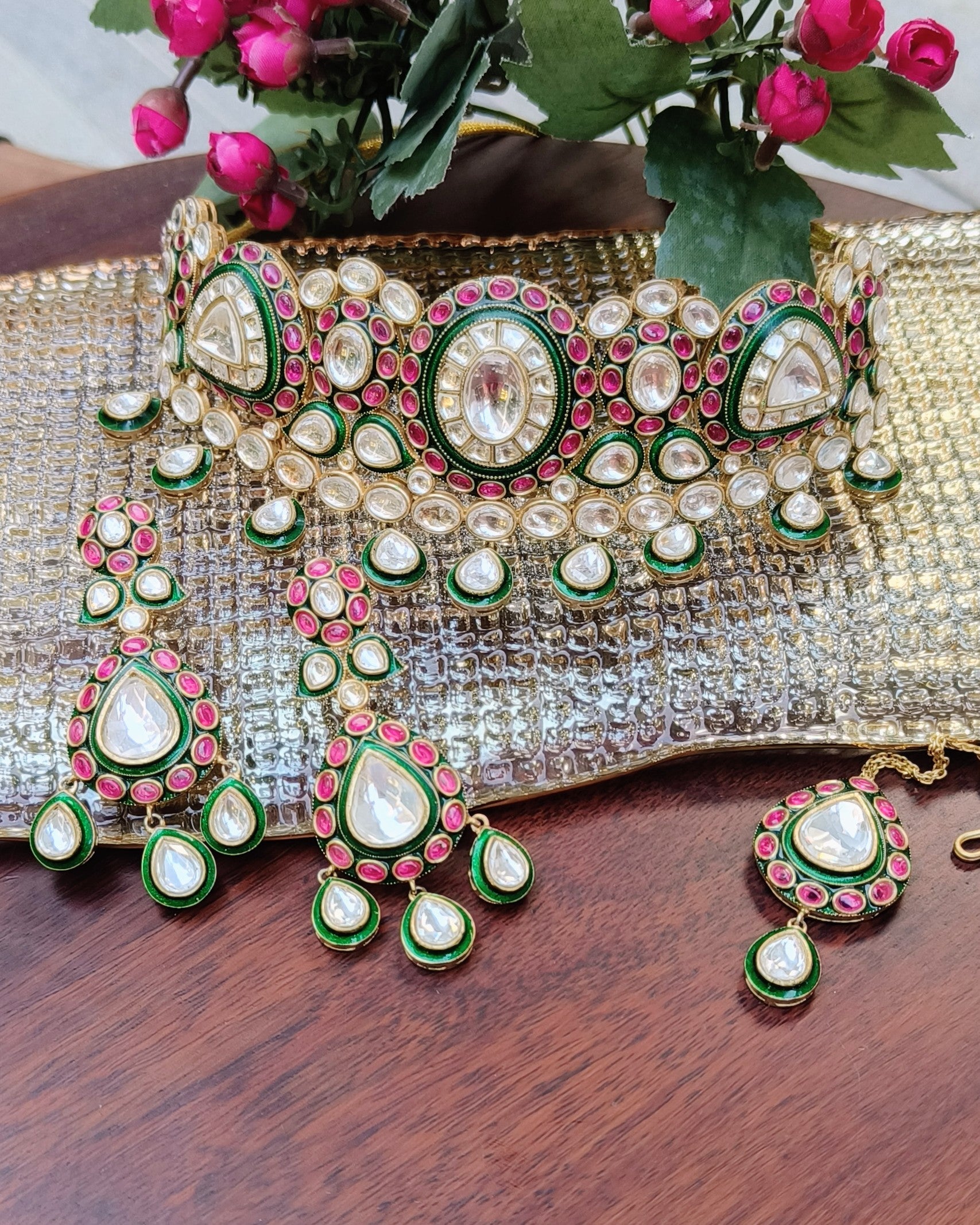 A mesmerising blend of tradition and opulence, Firah is a timeless masterpiece that captures the essence of royal artistry. Handcrafted in silver with gold plating, this exquisite choker set features intricate Meenakari work in vibrant hues of ruby pink and emerald green, adorned with uncut polki-style stones for a regal allure.