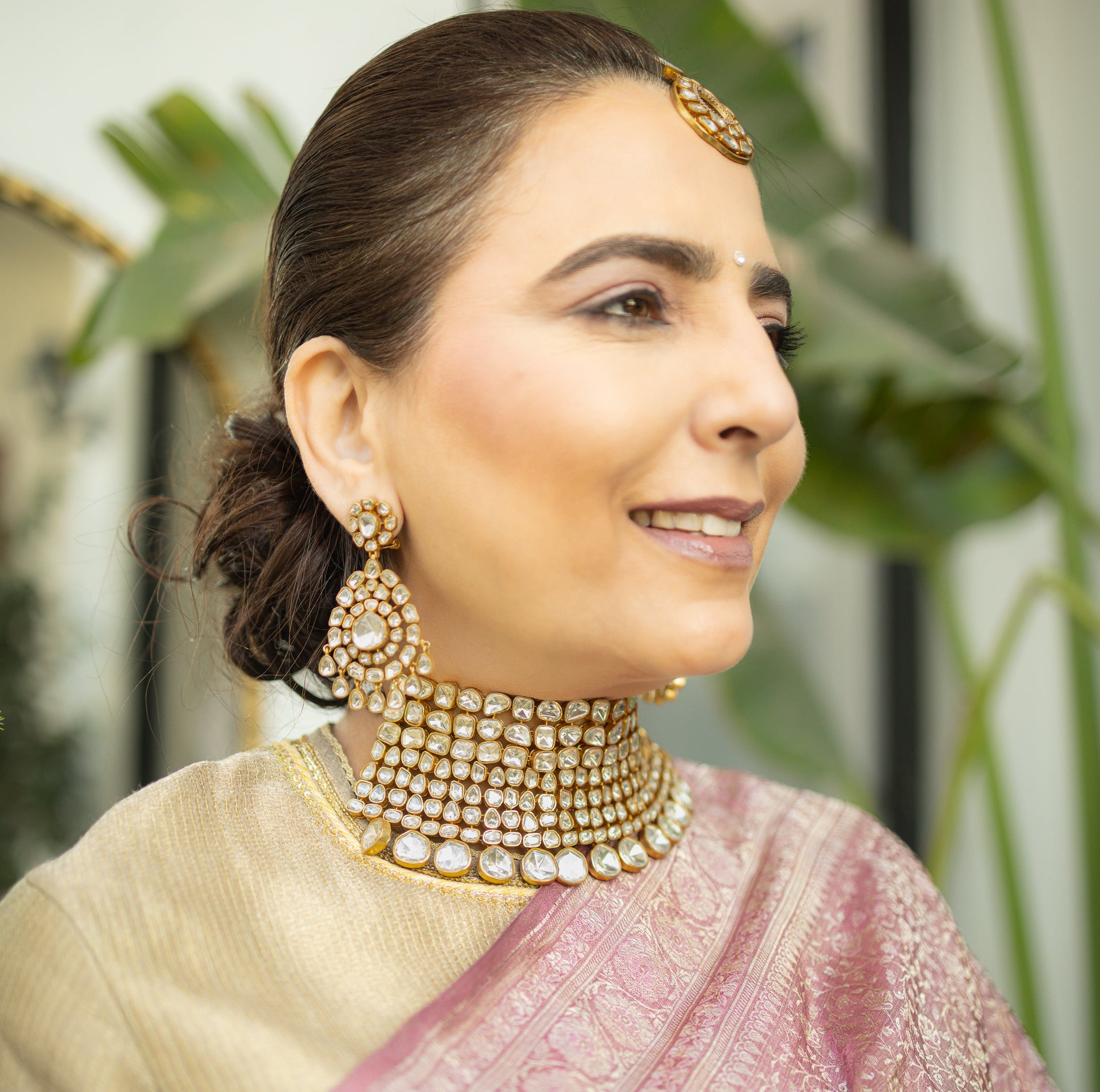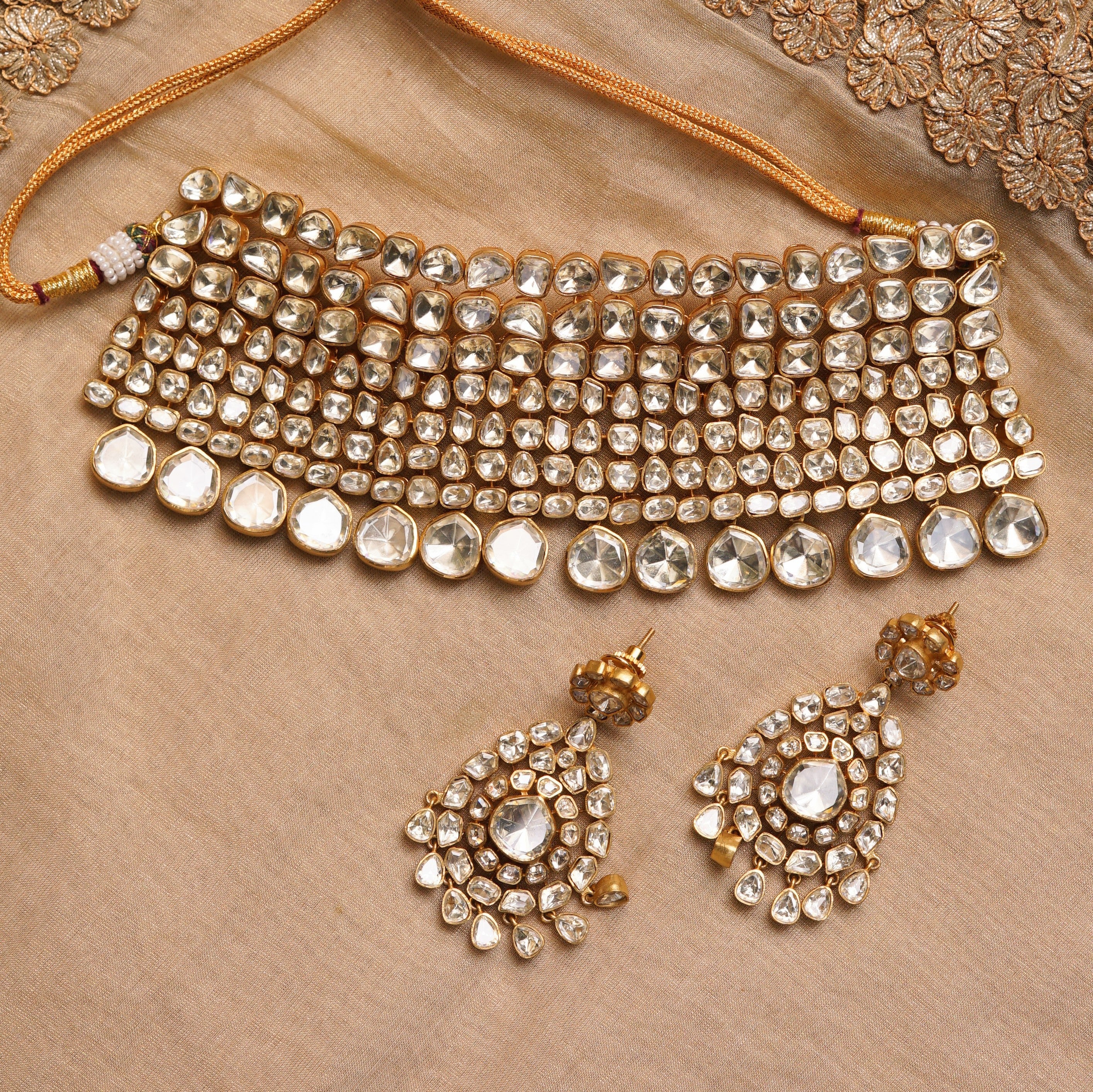 Elevate your wedding and festive looks with the Pulse Set, a radiant ensemble crafted to make a statement. This luxurious set features premium Mossanite Polki stones meticulously hand-set to create an opulent, multi-layered shine. The choker is paired with matching earrings, both designed to capture timeless Indian artistry.