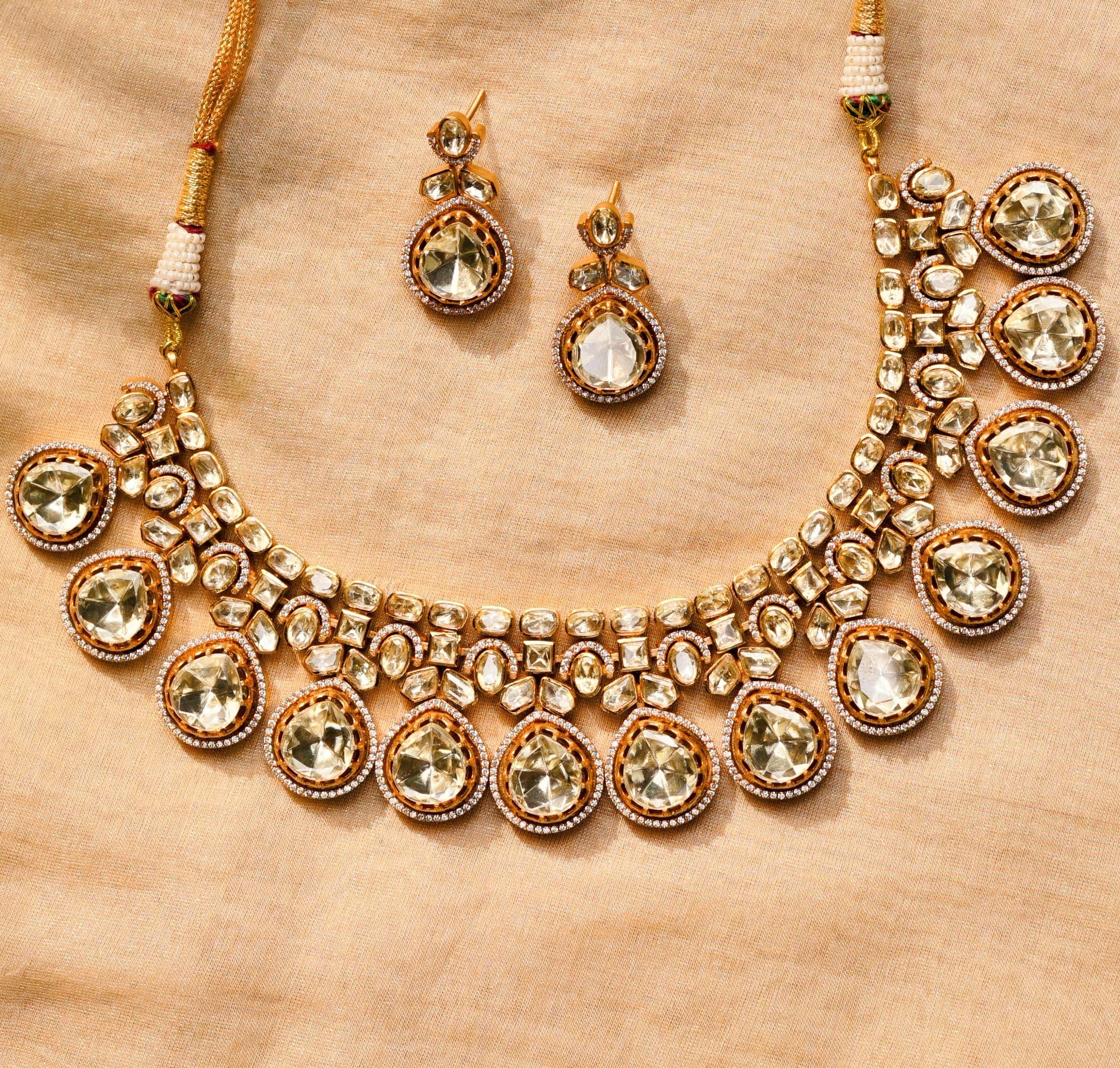 The "Echochip" is a dazzling choker-style necklace set that achieves a regal, antique Indian aesthetic through the sophisticated use of Moissanite Polki stones. This modern take on traditional jewelry utilizes lab-created Moissanite, a highly brilliant and durable stone, which is specially cut to emulate the raw, rustic elegance of centuries-old Polki (uncut) diamonds. The set, completed by matching drop earrings, provides the wearer with the authentic, high-impact look of a treasured heirloom piece—combining the rich heritage of India-inspired design with a more accessible, ethical, and sparkling contemporary stone.