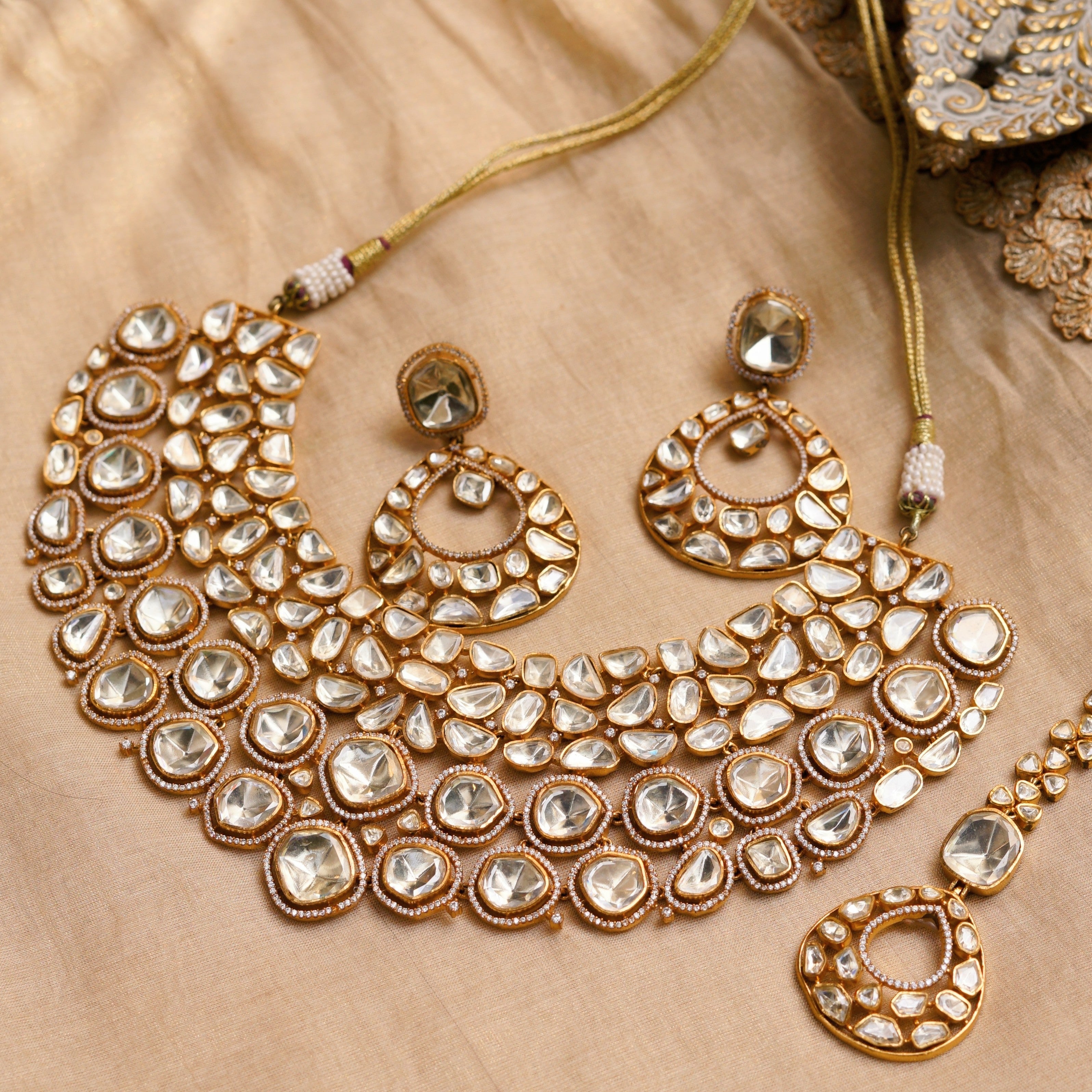 The Priyana Necklace Set is a magnificent statement ensemble crafted for grand occasions. Featuring a wide, tiered collar necklace, grand drop earrings, and a matching Maang Tikka, the entire collection is built on a durable brass base and finished with a rich gold plating and polish. Each piece is lavishly set with brilliant Moissanite Polki stones, delivering the spectacular sparkle and timeless aesthetic of traditional polki jewelry. Priyana is the ultimate choice for a powerful, glamorous, and unforgettable traditional look.