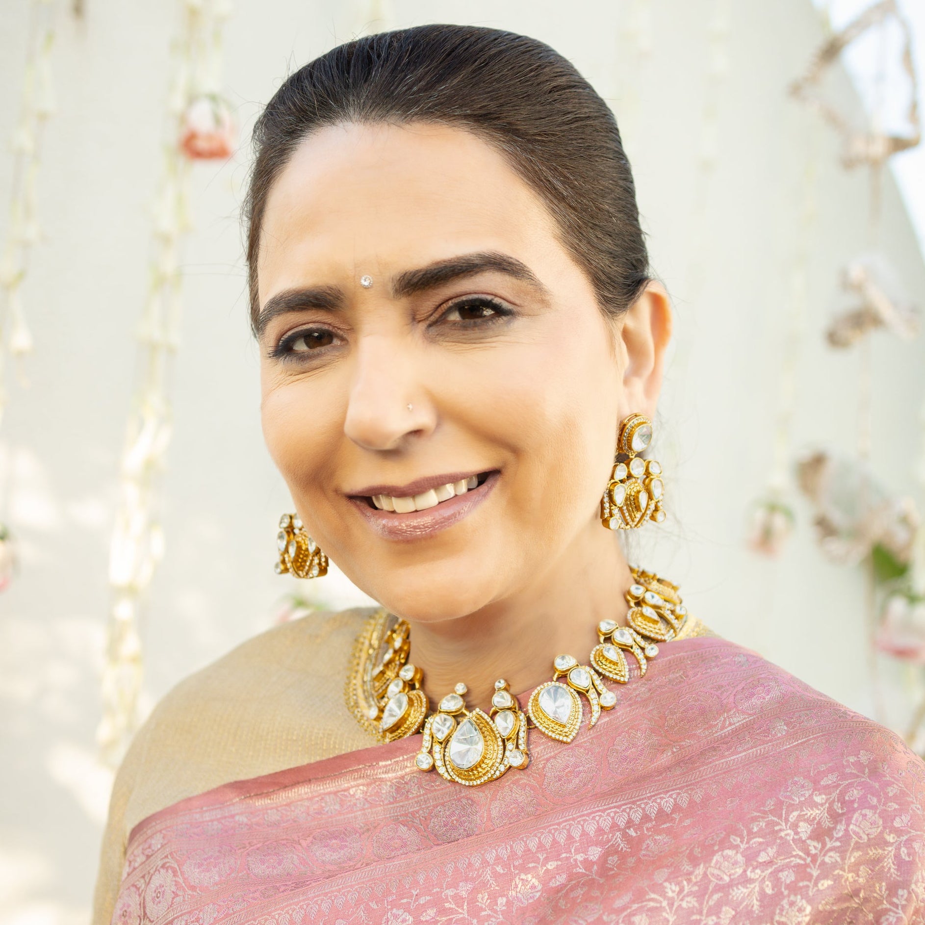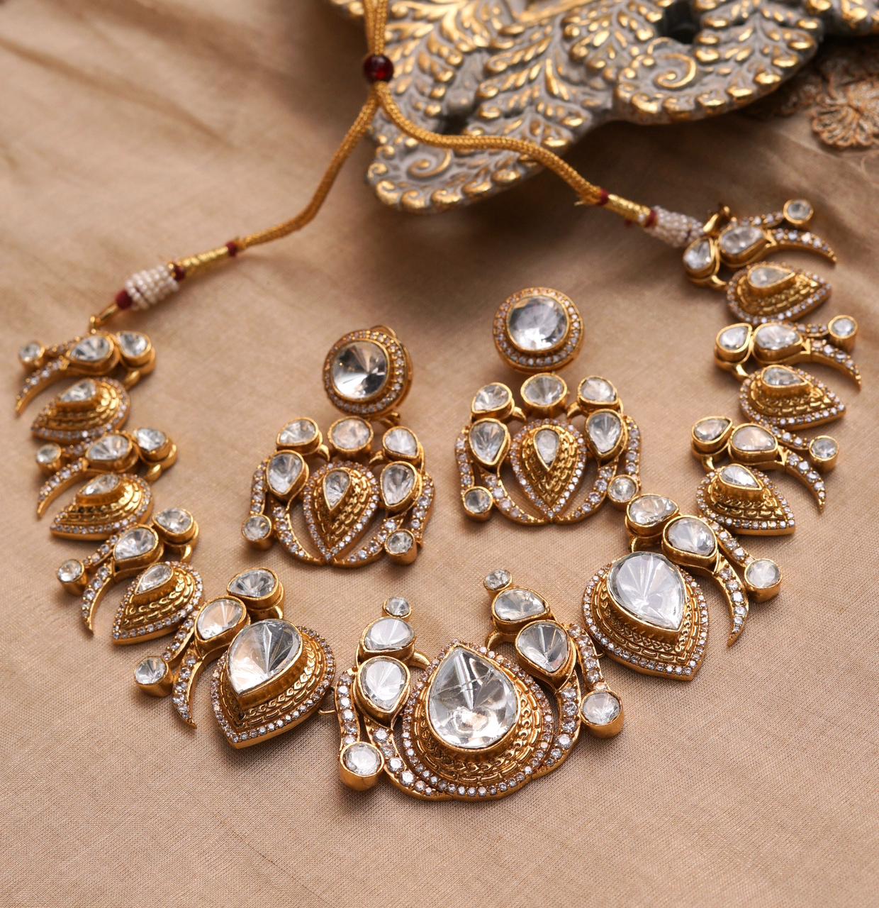 The Breeze Drop Necklace Set is a spectacular statement piece, expertly designed to command attention with its intricate, flowing artistry. Crafted on a durable brass base and finished with a rich gold plating and polish, this set features bold, ornate motifs resembling stylized leaves and teardrops. Each element is generously embedded with brilliant Moissanite Polki stones, ensuring intense sparkle and the majestic look of traditional heirloom jewelry. The accompanying stud-style earrings perfectly echo the main necklace motif, making the Breeze Drop Set the quintessential choice for a luxurious and impactful festive or bridal look.