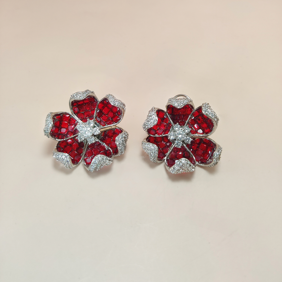 Invisible Settings Colored Crystal studs. Elevate your style with our captivating oversize stud earrings. Each earring features a seamless setting of vibrant colored crystals, exuding elegance and sophistication. The rhodium plating ensures enduring allure and a touch of glamour for every occasion.