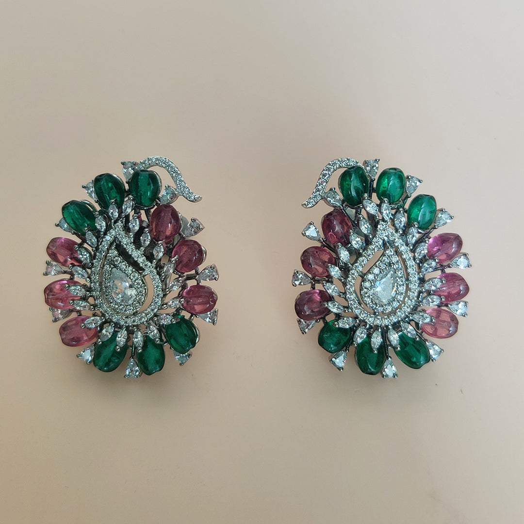 Dive into the charm of Victorian vintage jewelry with intricately designed earrings and a neckpiece adorned with multi-colored stones and pearls.