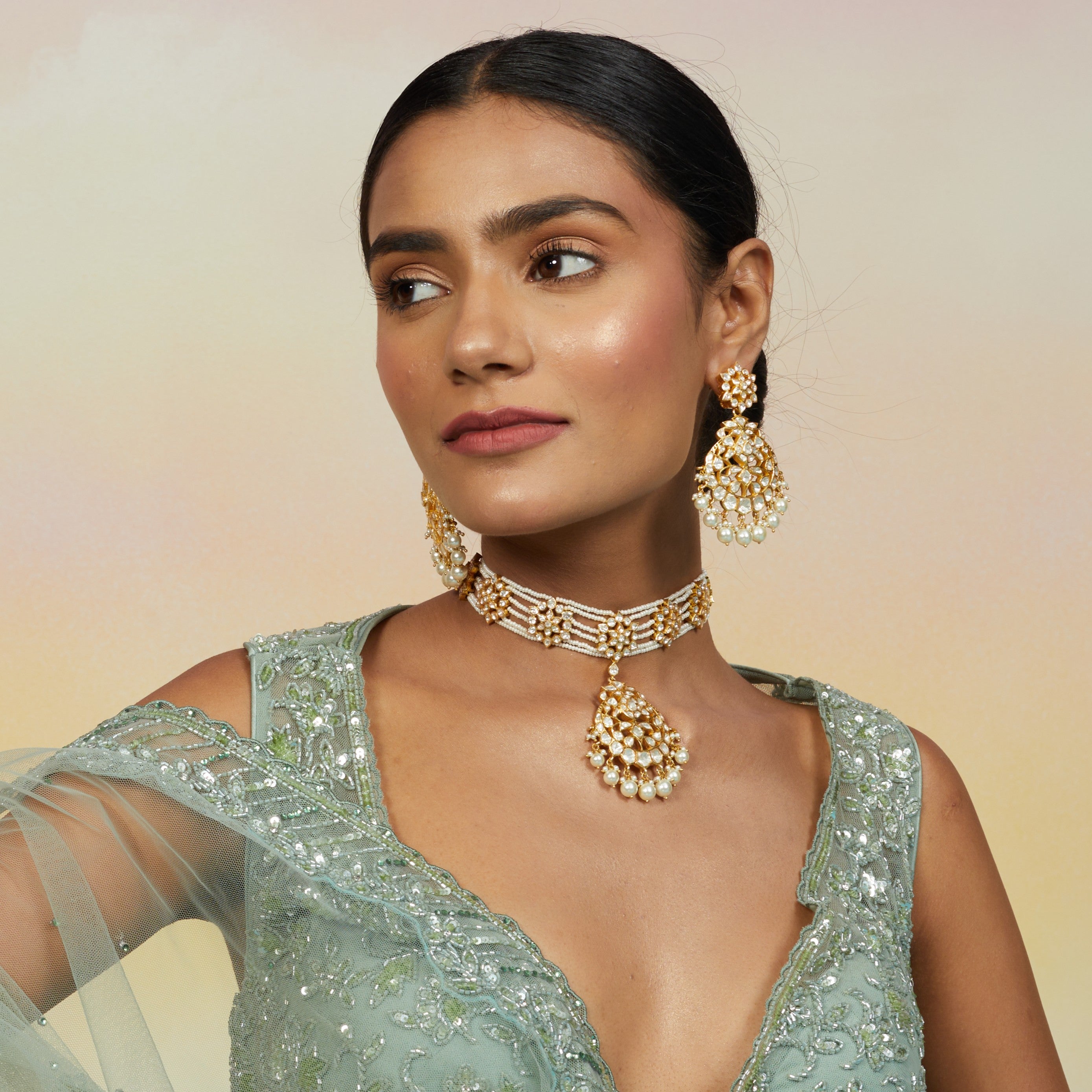 Introducing The Glintique Choker Set, a spectacular ensemble that captures enduring elegance. Meticulously crafted in radiant 92.5 silver with a luxurious gold finish, this set is adorned entirely with brilliant moissanite polki stones, delivering the spectacular sparkle and vintage look of traditional polki jewelry. The set features a structured, intricate choker and grand matching chandelier earrings, both beautifully accented with lustrous dangling pearls.