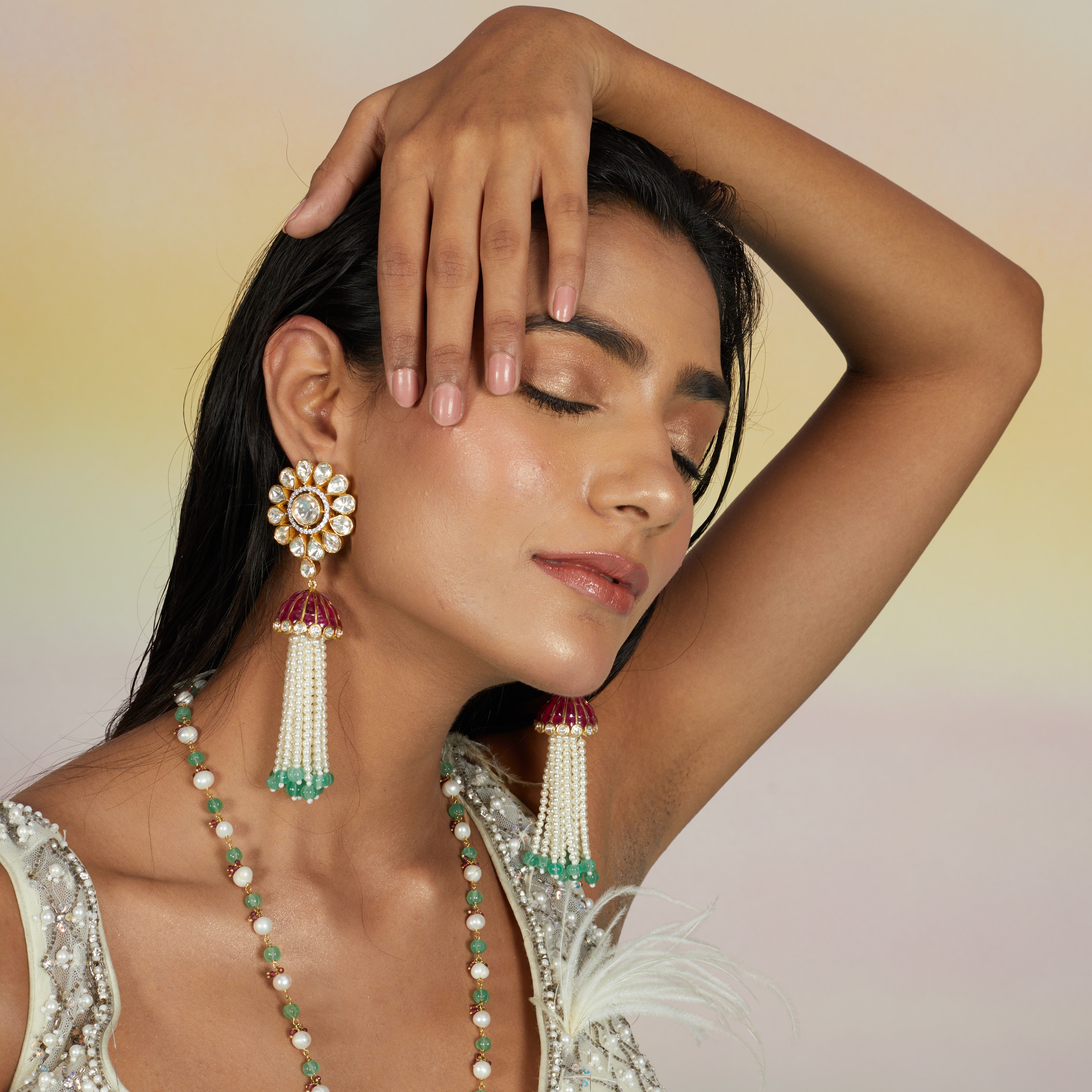 The Maharani Tassel Earrings, exquisitely crafted in 92.5 silver, are designed for the modern royal. These statement pieces feature a dazzling floral stud top, set with brilliant moissanite polki stones that capture the light with incredible fire. Dangling beneath, luxurious tassels are created from strands of pristine white beads (or pearls) accented with elegant green beads, and topped with rich maroon or ruby-toned stone accents. Perfect for elevating any festive or formal ensemble, these earrings pair beautifully with the accompanying layered necklace featuring green and white beads, promising a look of unparalleled grandeur and style.